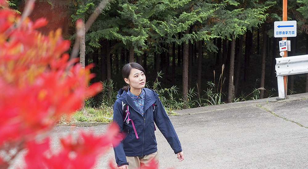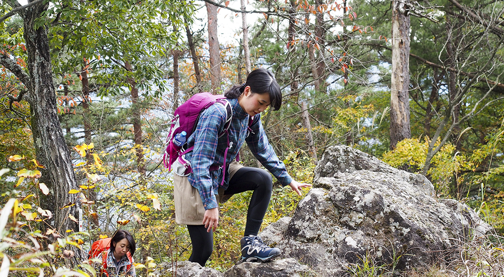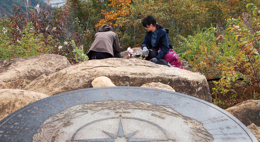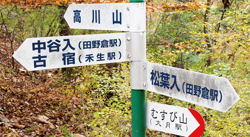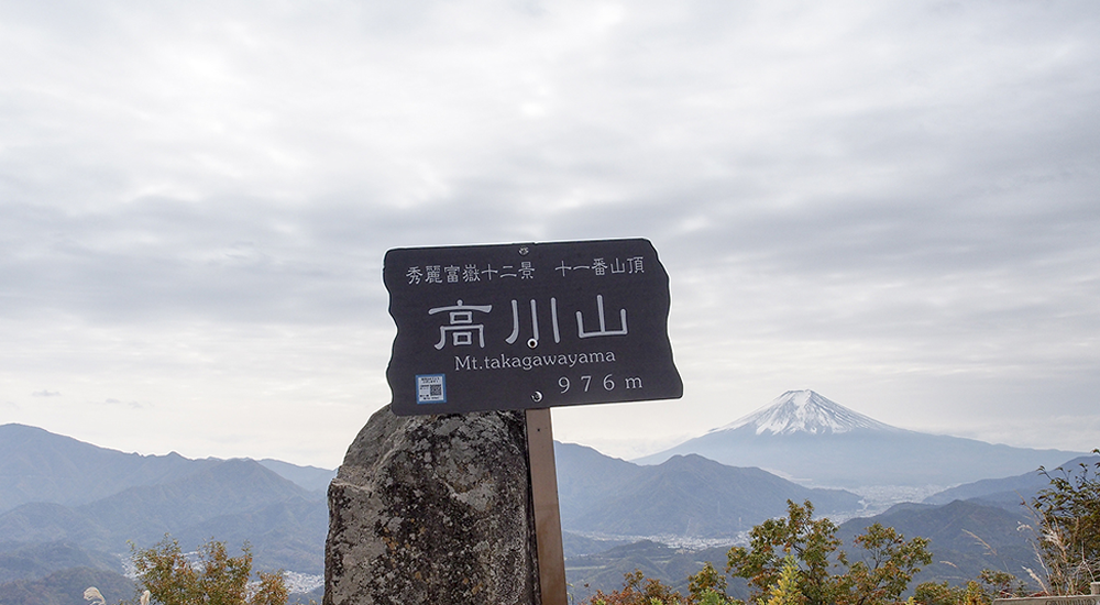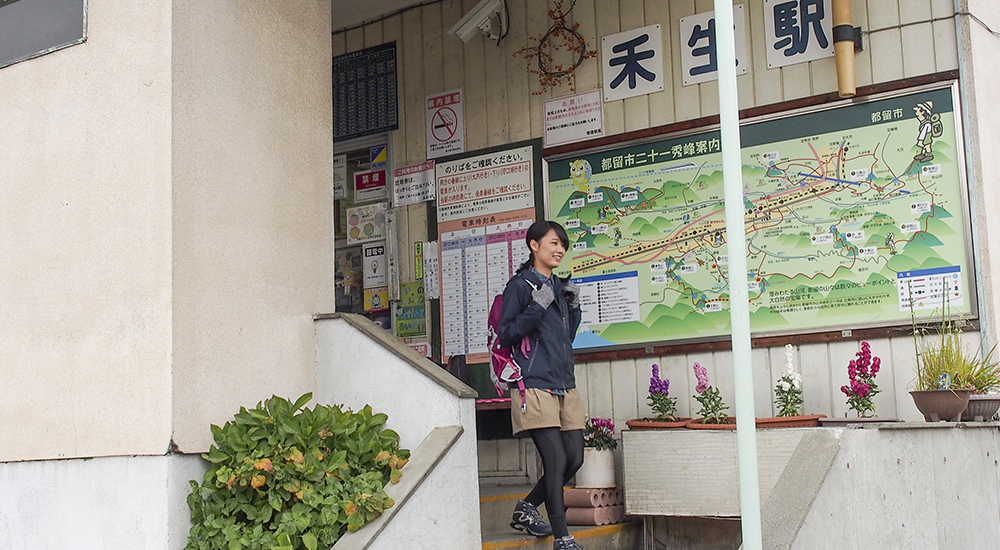 禾生駅から古宿集落まで約30分車道を歩きます。集落を過ぎたら山道に入り、少し歩くと分岐に出て、シラノサワコースと古宿コースに分かれます。古宿コースは山頂まで70分、シラノサワコースは90分と時間的には少しかかりますが、展望はシラノサワコースのほうが良いです。ただしシラノサワコースは山頂直下に大岩があり、そこを登らなければなりません。不安な人は古宿コースから登りましょう。ここではシラノサワコースを進むことにします。少し沢沿いを歩きますが、すぐに外れて尾根に取り付きます。尾根道からは富士山が樹林の間から見えるようになってきます。徐々に高度を上げ、トラロープのぶら下がった大きな岩場が見えてきたら山頂はもうすぐです。360度の展望を満喫したら、山頂から北東側にのびるルートを下ります。山頂から道標に従って下ると狼煙台跡があり、その先で分岐になります。今回は中谷入・古宿の道標に従いリニア見学センターを目指します。いくつかロープも出てきますので慎重に下ります。再び分岐にぶつかりますが、左の中谷入方面に向かいます。(右方面は古宿から禾生駅方面)。丸木橋を渡り、急坂が終わると林道に出ます。中谷の町に入り10分ほど歩くとリニア見学センター到着です。道の駅つるまではすぐです。道の駅つるで一休みして地産のお土産などをお楽しみください。